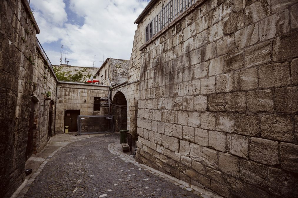 A főkapu mögötti mélyudvar a rámpa felől az átépítés előtt; ez a tér is eltűnt, bár eredeti állapota tökéletesen helyreállítható lett volna (fotó: Kárász Karolina / Várgondnokság)