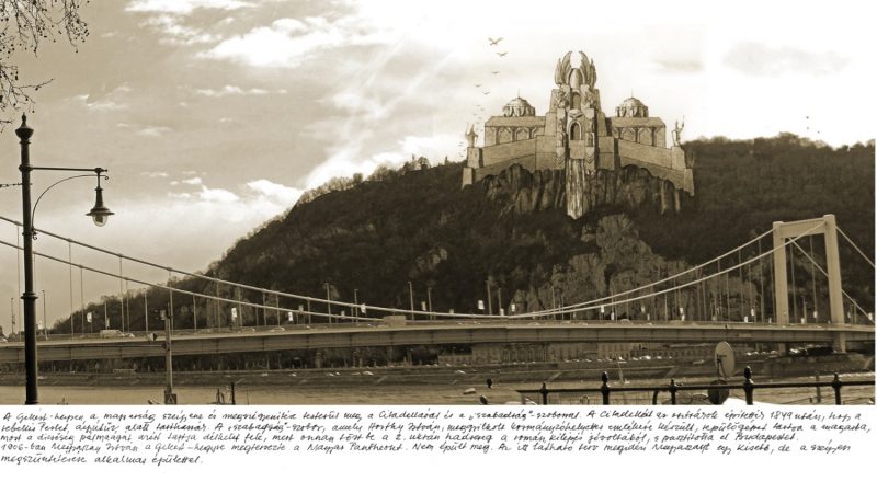 A Gellért-hegyen a magyarság szégyene és megszégyenítése testesül meg a Citadellával és "Szabadság"-szoborral. A Citadellát az osztrákok építették 1849 után, hogy a rebellis Pestet ágyútűz alatt tarthassák. A "Szabadság"-szobor, amely Horthy István meggyilkolt kormányzóhelyettes emlékére készült, repülőgépet tartva a magasba, most a dicsőség pálmaágát azért tartja délkelet felé, mert onnan tört be a 2. ukrán hadsereg a román kilépés jóvoltából, s pusztította el Budapestet. 1906-ban Medgyaszay István a Gellért-hegyre megtervezte a Magyar Pantheont. Nem épült meg. Az itt található terv megidézi Medgyaszayt egy kisebb, de a szégyen megszüntetésére alkalmas épülettel.