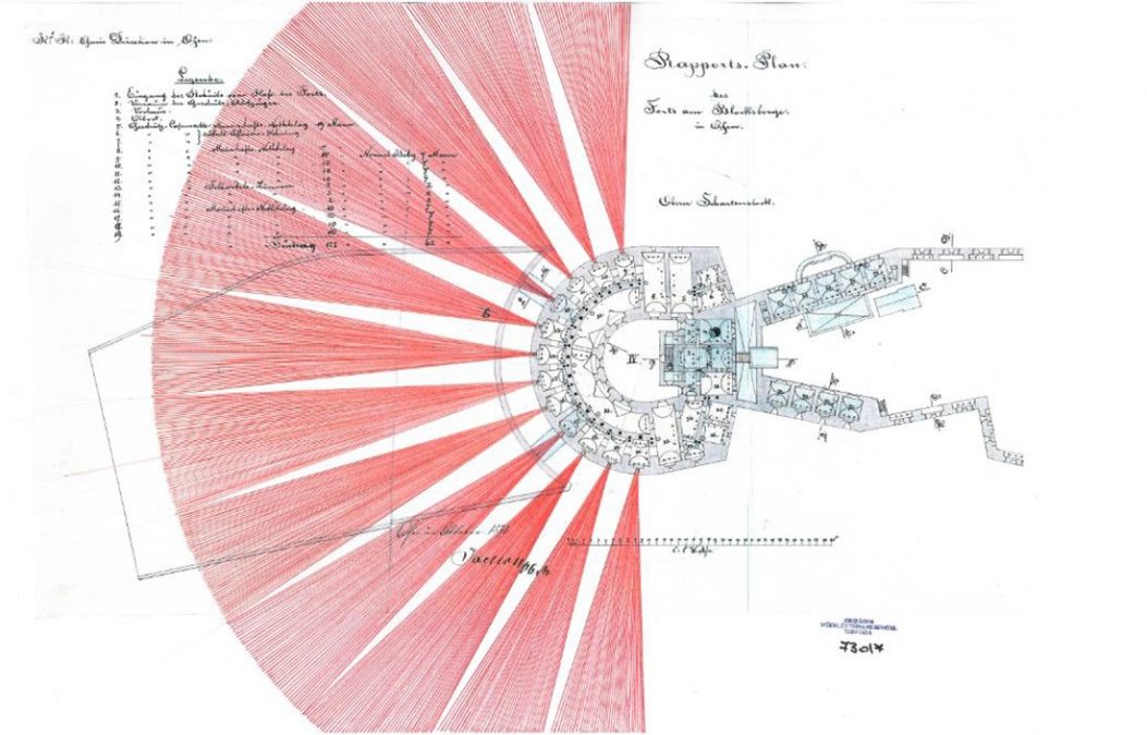 Az ágyútorony lőréseiből pásztázható terület a glacison az 1871-ben felvett Rapports-Plan szerint: a Citadella nem Pest felé van tájolva